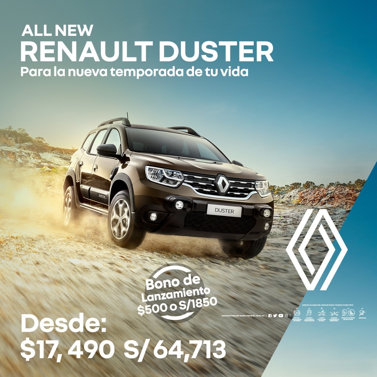 Modelo comercializado en 64 países, con más de 1 millón de unidades vendidas a nivel mundial y con más de medio millón de unidades rodando por toda América Latina. El All New Renault Duster tiene en su ADN un estilo todoterreno, equipamiento superior, alto rendimiento, tecnología y amplia capacidad de maletera.